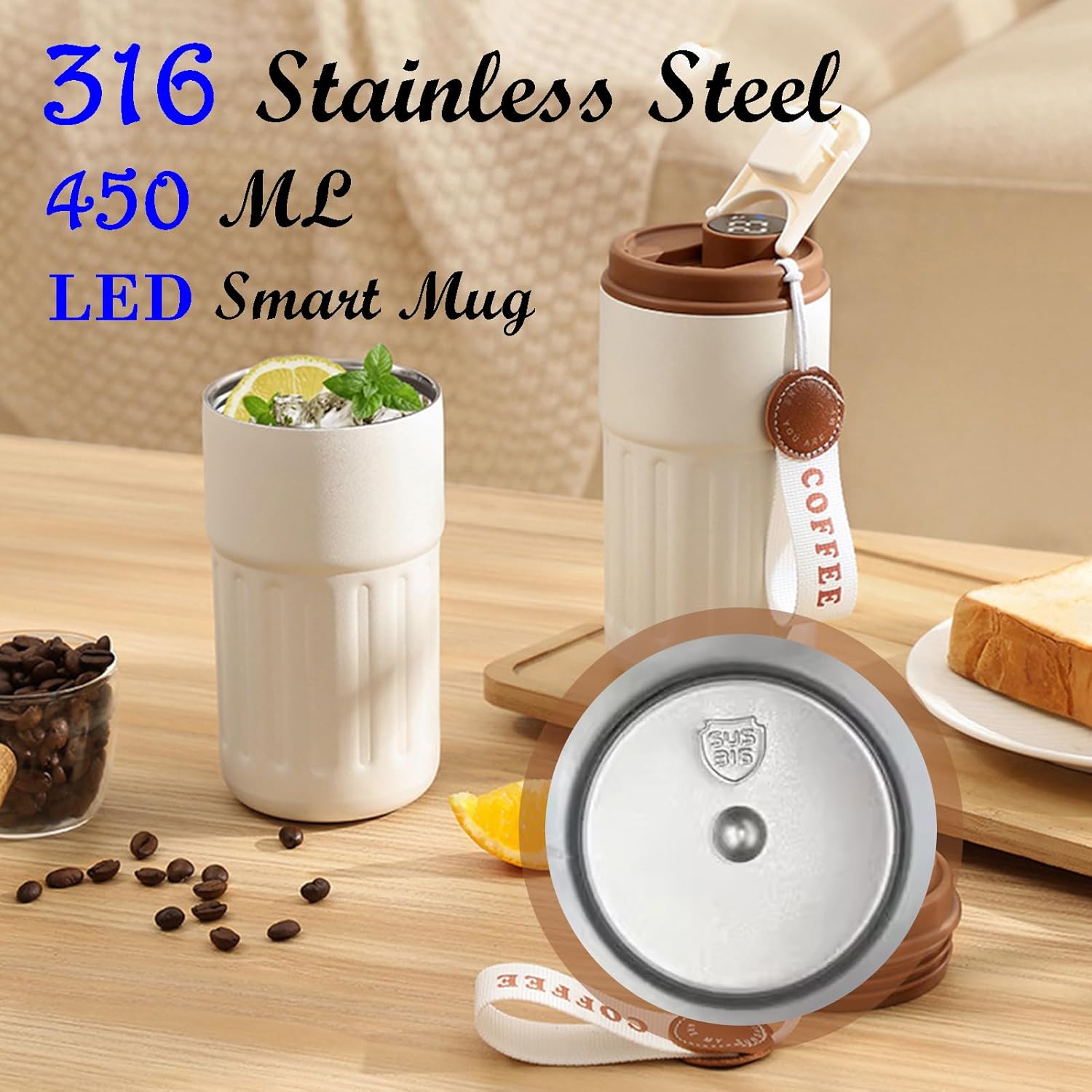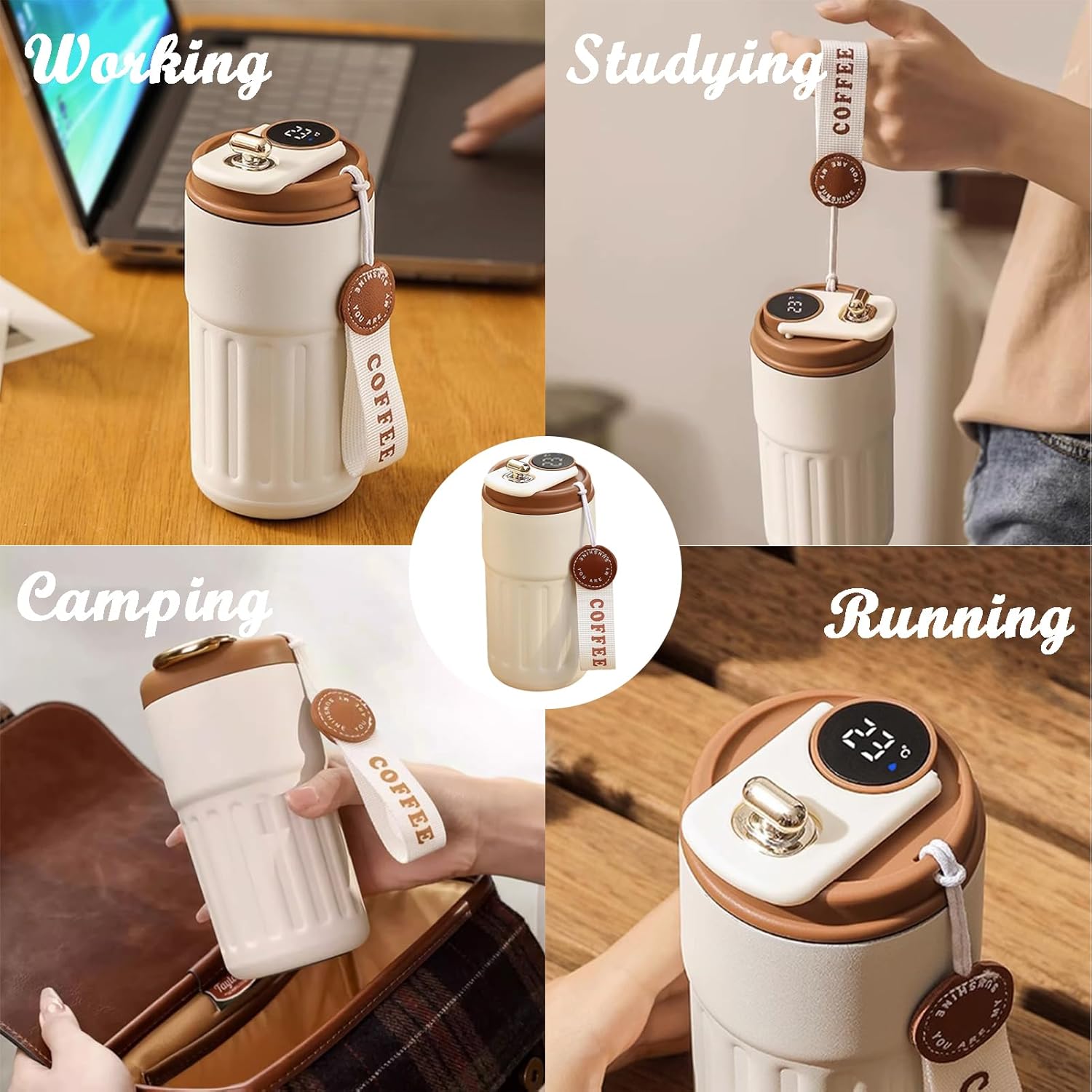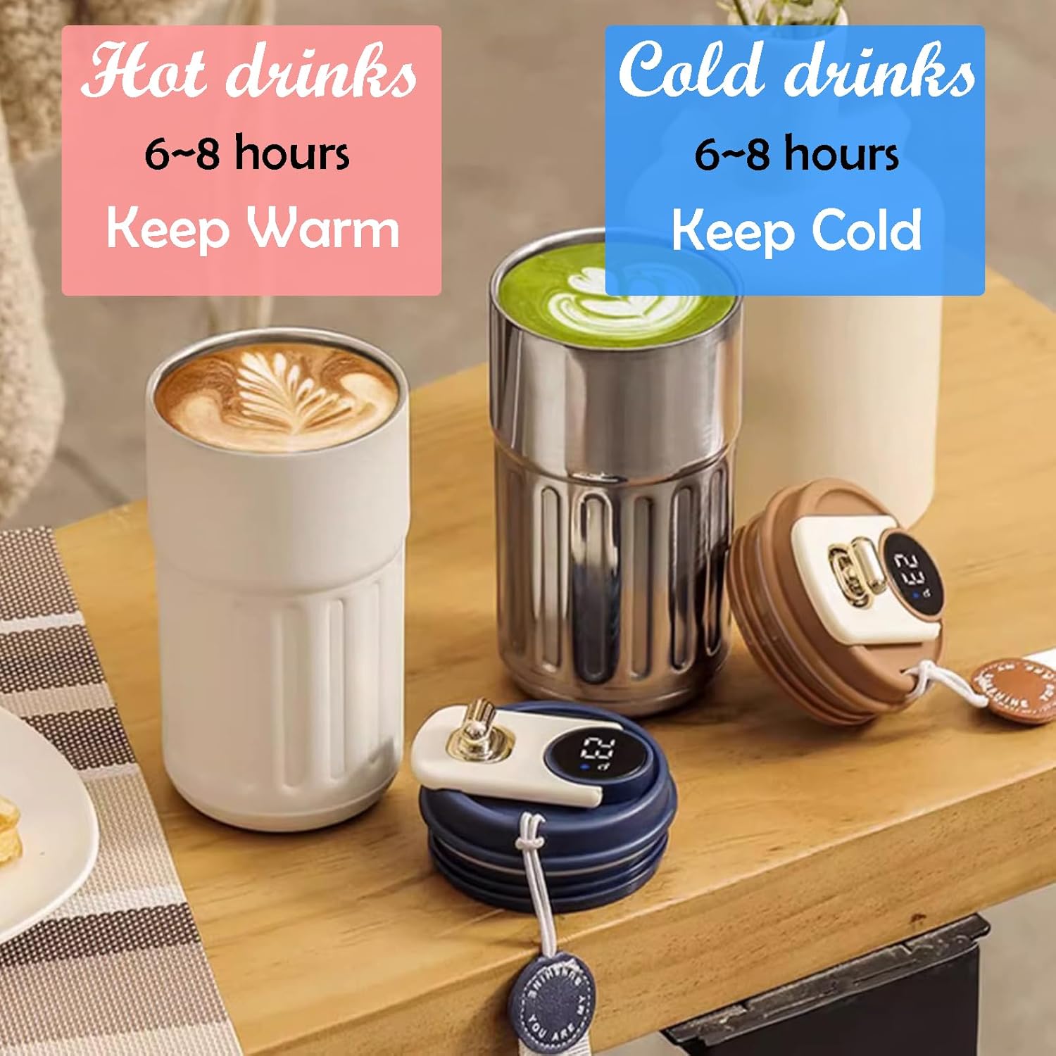 - 【LED Smart Temperature Display】This insulated coffee cup has built-in smart chips and technology that instantly displays the internal liquid temperature when you touch the display. LED has three intelligent temperature display colors. It displays green when the internal liquid temperature is 0~30°, yellow when 31~54°, and red when 55~97°. There is no need to worry about scalding your mouth.