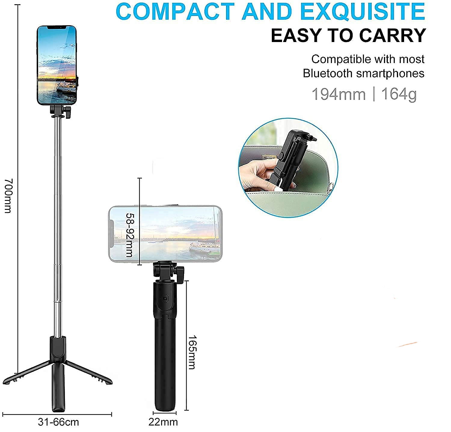 100% BRAND NEW The Bluetooth selfie stick is super adjustable which provides a 180° vertical rotation angle of bracket and a 270° horizontal rotation angle of phone holder, so that you can choose the best angle when you take photos/ videos for the sweet moments. Prefect for party, travel and any occasion you want to record meaningful time Bluetooth remote shutter (Support 10m remote control), liberate your hands. You can take down the remote control to take pictures/ videos, for a close self-photography or extend it to get a larger scenery The folded length is just 19.5cm with only 172g weight, so it can be easily and freely put into the bag while you don’t need its help. Mini size is super convenient to carry What's more, it can be extended up to 79.5cm. Even though it is fully stretched, it is very stable due to the double grooves of aluminum, so you will not worry about image blur.